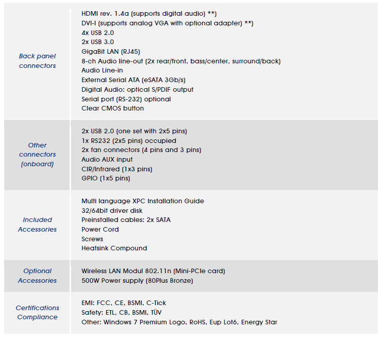 Il pannello posteriore invece ospita varie connessioni: HDMI rev. 1.4a, DVI-I, 4x USB 2.0, 2x USB 3.0, porta GigaBit LAN (RJ45), connettori 8-ch Audio line-out (2x rear/front, bass/center, surround/back), Audio Line-in, External Serial ATA (eSATA 3Gb/s) ed uscita digitale/ottica S/PDIF.