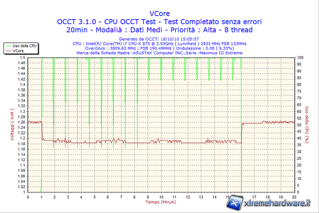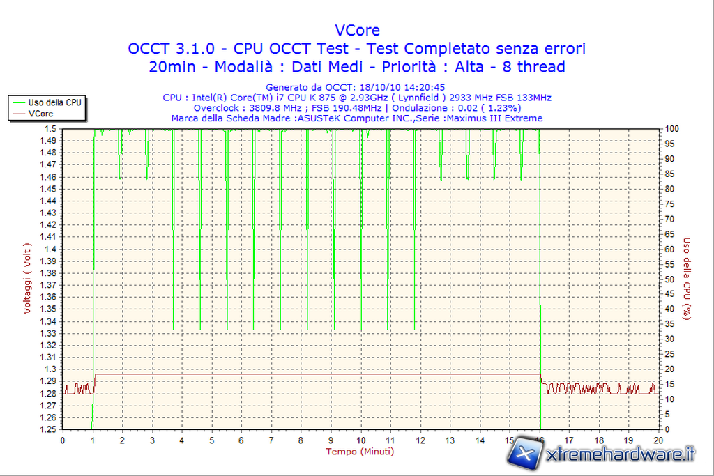 Nella primissima fase di test abbiamo utilizzato il software OCCT per poter testare accuratamente il vDROOP della mainboad; i diversi settaggi testati sono AUTO, 0%, 50% e 100% di attivazione del Load Line Calibration. Il vDROOP è la variazione di tensione di alimentazione del processore tra la modalità IDLE e la modalità FULL LOAD del processore stesso.